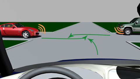 1. červené vojde do križovatky a dá prednosť v jazde protiidúcemu modrému, 2. zelené, 3. modré, 4. červené dokončí odbočovanie vľavo