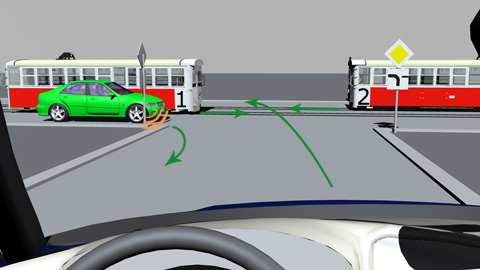1. vaše vozidlo súčasne so zeleným, 2. električka č. 1 súčasne s električkou č. 2