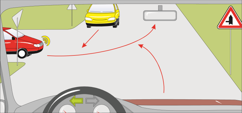 nesmie ohroziť vodiča červeného vozidla jazdiaceho v priebežnom jazdnom pruhu, do ktorého prechádza.